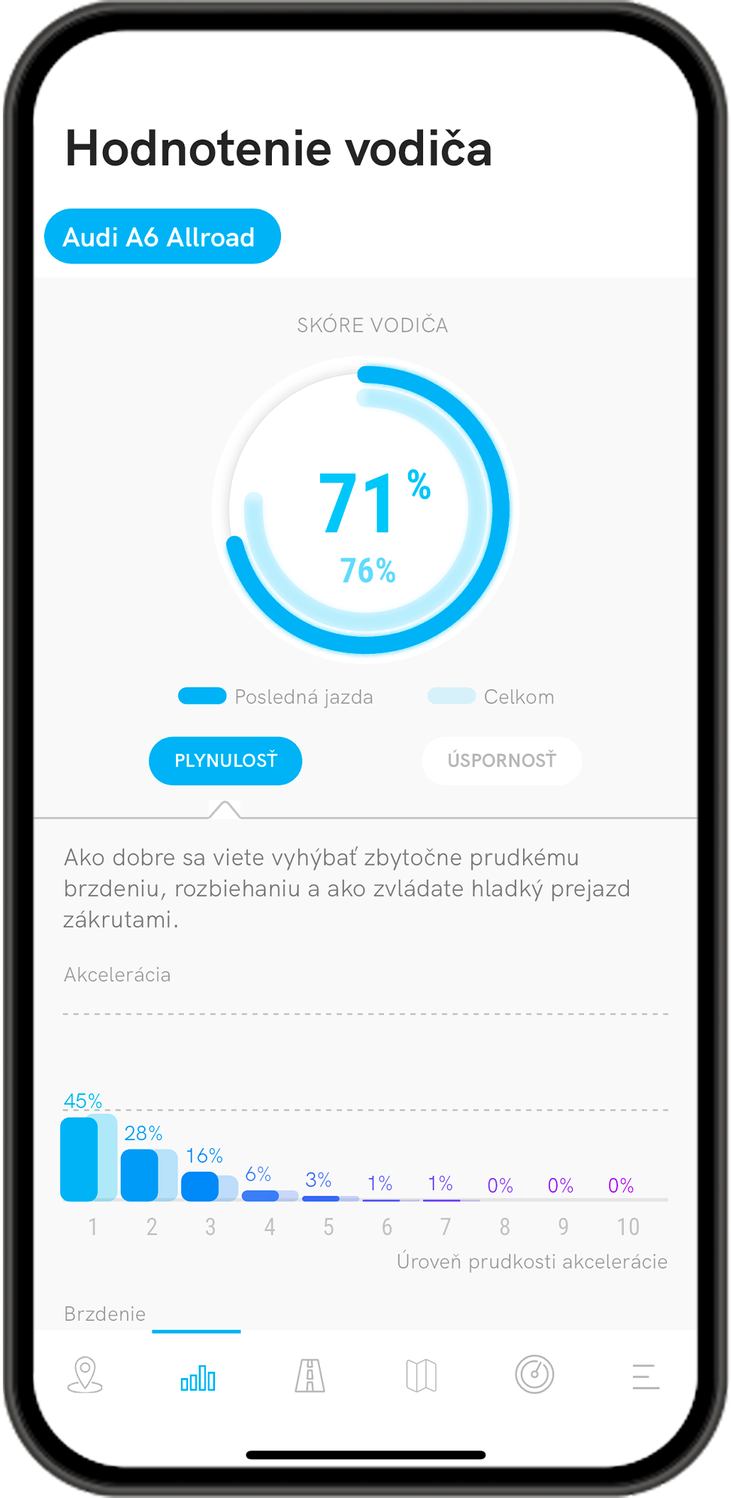Vďaka našej službe môžete získať aj hodnotenie vodiča. Sledujeme štýl jazdy a poskytujeme vám spätnú väzbu, ktorá vám pomôže zlepšiť bezpečnosť na cestách a znížiť spotrebu paliva.